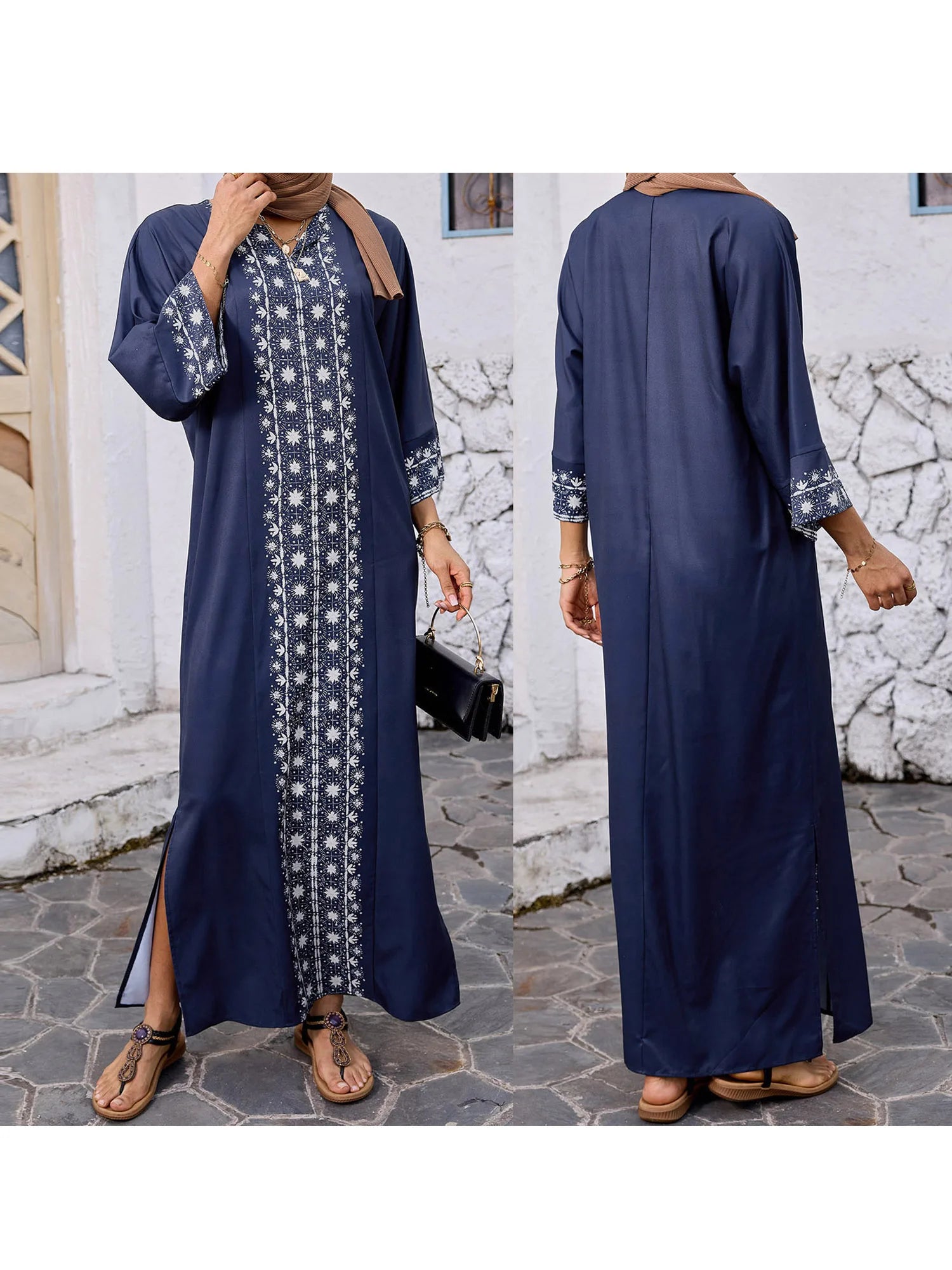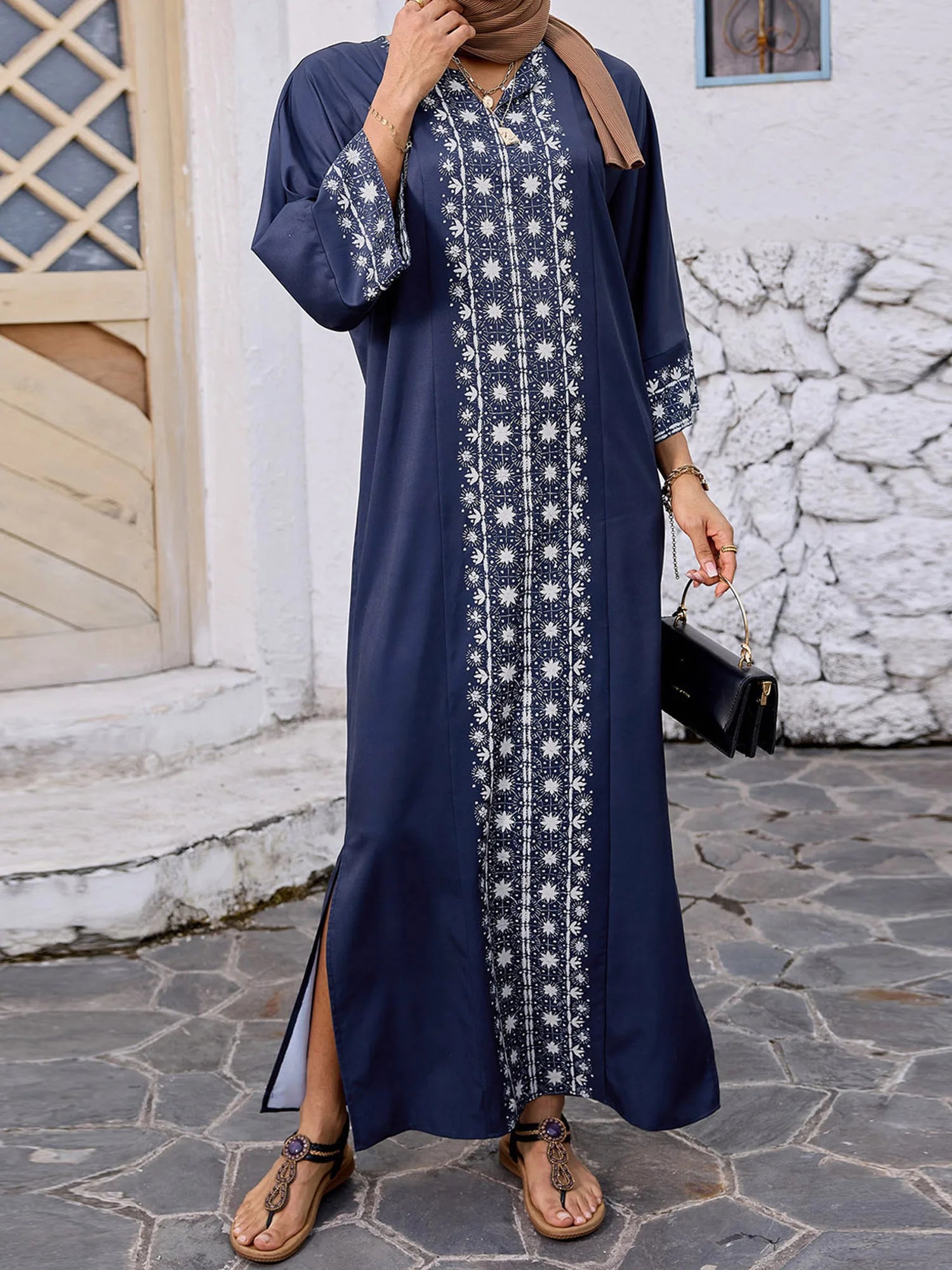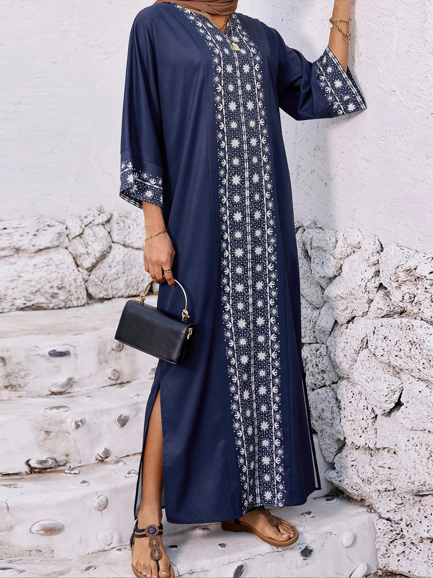 Elegant Floral Print Maxi Dress with 3 4 Sleeves V-Neckline and Loose Fit - Perfect for Ramadan Arab Robe Caftan and Gowns